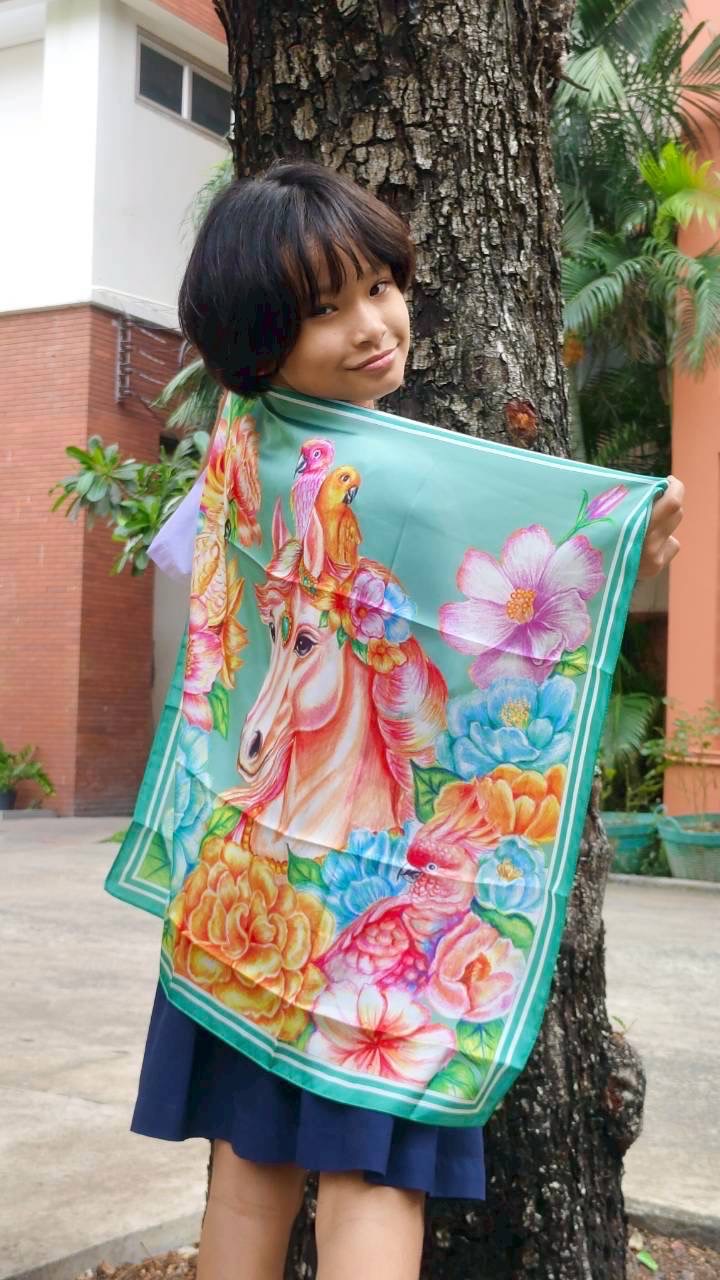 ผ้าที่ใช้ : ผ้าไหมซาติน นุ่มลื่น สีสันสดใส รีดง่าย สามารถนำมาเป็นเครื่องประดับทั้งพันคอ